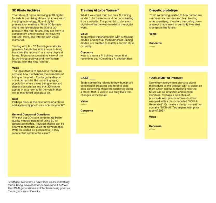 As I was researching about the topic, I tried to spread the net by looking at existing references and inspirations. Listing down the different values and comments on the existing works, hoping that I could take pointers of what I'm interested in and integrate it to my own project. Subsequently, I tried ideating from the inspirations gathered put them all in a single board before analysing them again.