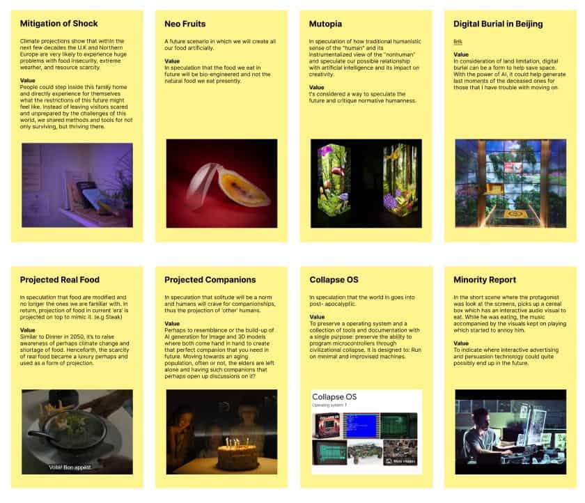 As I dive into the topic of Speculative Design, an exhibition named "Dinner in 2050" was held at Dubai to comment on the climate change and food sources become scarce. With that in mind, they cleverly approached the topic with a twist involving the power of AI to project food that was different from what the visitors input into the speech recognition device. That's when I realised that I wanted to do something that involves the interaction and experience along with speculative design. The value of such, was to perhaps open up discussions when people view the works and that is something I want to work on moving forward. It also brought a new term that I might want to explore which was "AI Powered XR"