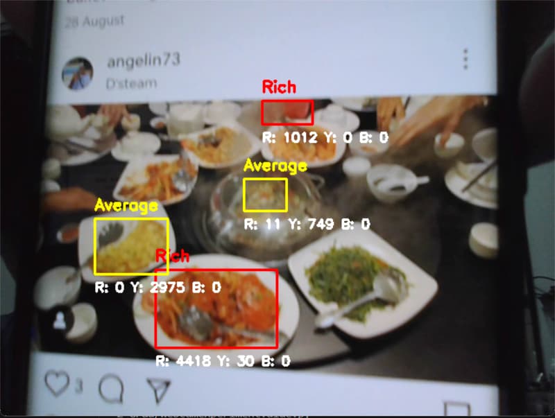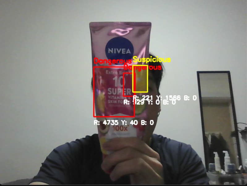 The testing was then further expanded with measuring the 3 RGB values, I then tried to implement meanings to the values showed and determine whether if the item/object is suspicious base on a certain pixel threhold that I've set to trigger the change. I then tried on the different objects that see the effects of this exercise. I also tried changing the value with more meanings that could relate to my topic, like having a certain amount of dominant pixel would determine if the data is rich or poor.