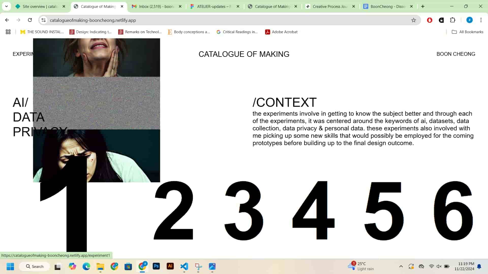 For the catalogue of making, I decided to go with a website to better display the footages for the experiments that I've done with computer vision. The website was also designed with intention to use horizontal scrolling effect to give the gallery viewing experience as viewers scroll through the website. The landing page was designed such that the viewers can a clear view of all the experiments, upon hovering on the numbers, they can view the snippets of image about the experiment.