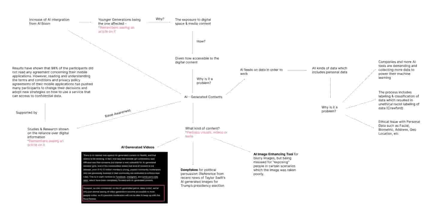 As I worked towards finalizing my design statement, patterns in my readings and research pointed to a key issue: "AI-generated content poses a heightened risk of overexposing younger generations to disinformation and explicit content." This insight has helped me refine the focus of my project, allowing me to reposition my experiments to address the connection between personal data privacy and AI-generated content, particularly with a younger audience in mind. By aligning my experiments with this focus, I aim to highlight the importance of protecting younger generations from these risks while fostering awareness about ethical AI practices.