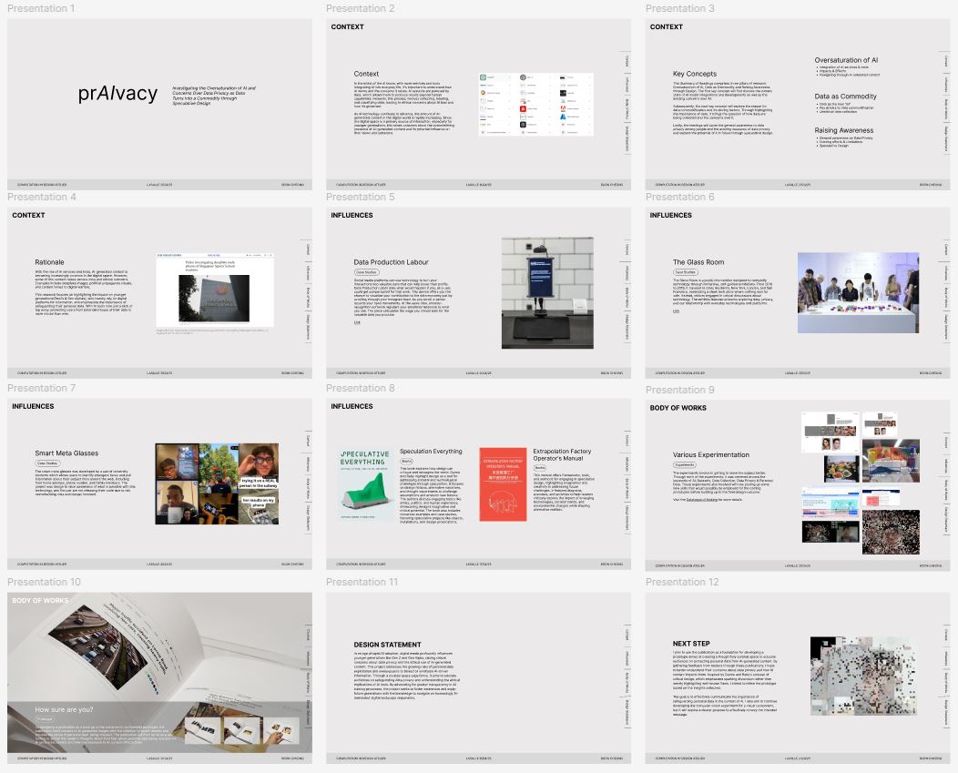 To be honest, I feel there’s still so much more I could have achieved with this project. However, I found myself caught in a constant cycle of going down rabbit holes. The expansive nature of AI as a topic made it challenging to stay focused, and tying together the experiments into a cohesive narrative proved to be a tough process. Ultimately, I plan to use the break to refine my structure and approach for Semester 2, ensuring a clearer direction moving forward. For the prototype, I feel it was somewhat rushed due to unforeseen circumstances that disrupted my momentum in the final weeks, which I aim to address with better planning in the next phase.