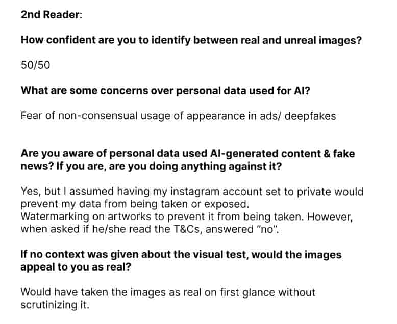 The user testing was insightful. From the visual test, when the viewers are being told that they were to identify between the real and generated image, instinctively viewers will start to look out for details that may seem out of the norm.