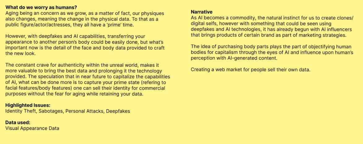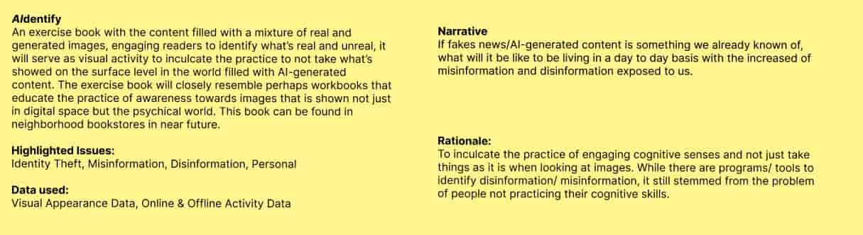 It gave me an idea about the issue that I'm trying tackle which was AI-generated content which includes DeepFakes, Misinformation & Disinformation. It made me think about how I can make it more relatable to audience and how I can raise awareness, but I went down a rabbit hole with more questions about the speculated future.