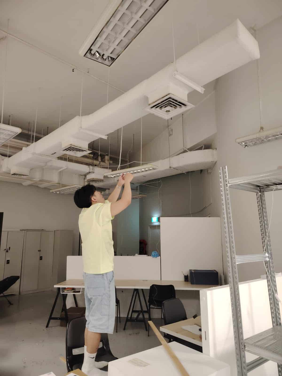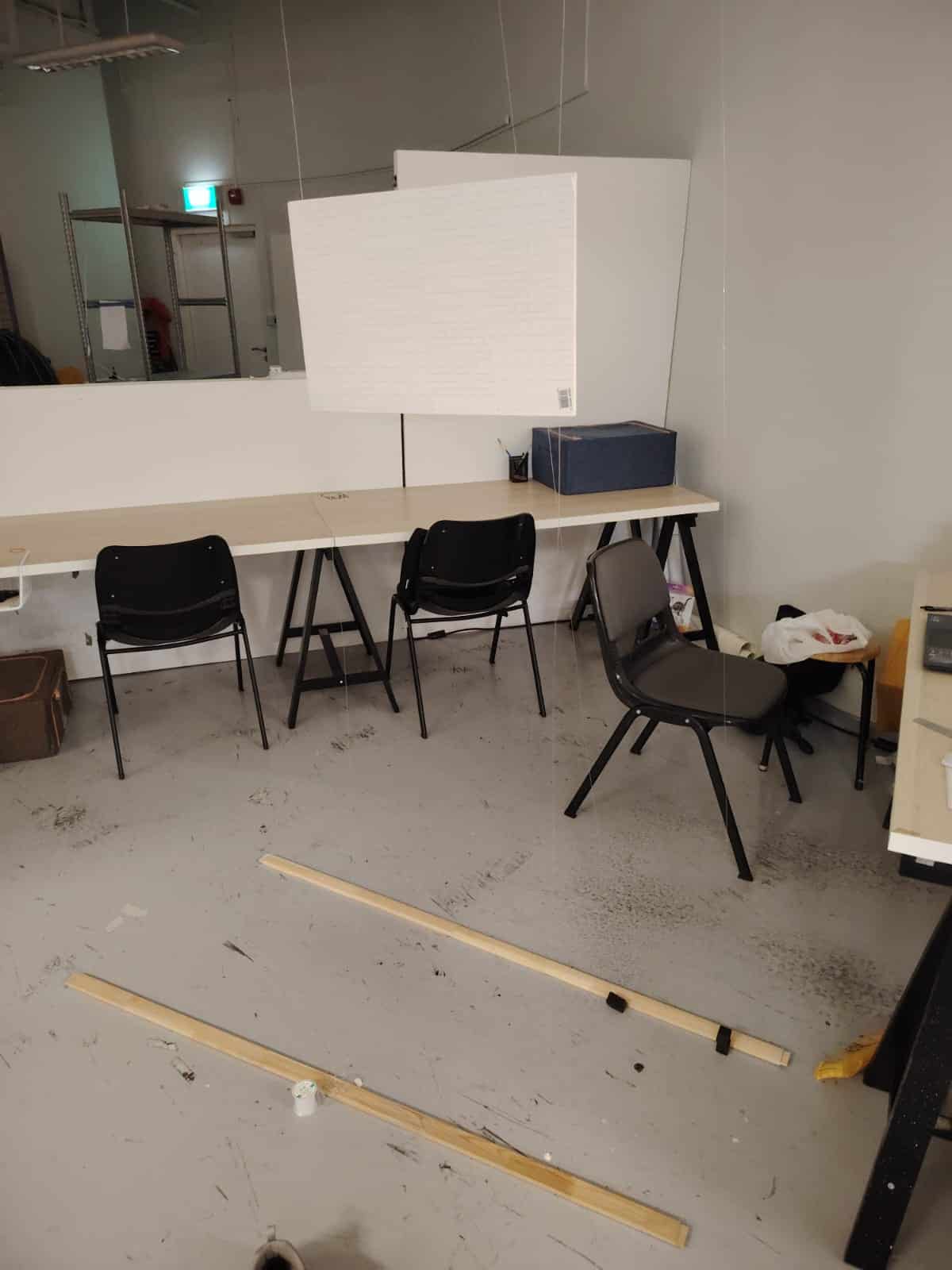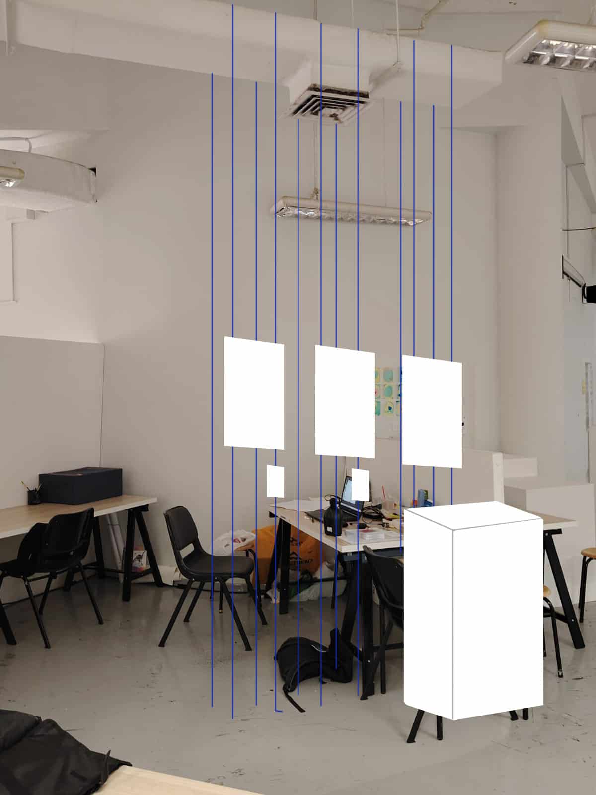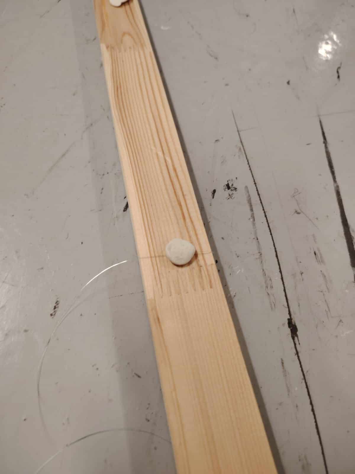To execute this setup, I will use small weights tied to fishing lines, positioning them over the vents. By securing both ends with additional weights, tension will be applied to keep the lines straight, allowing the screens to hang neatly in place. Therefore, I went to get two wooden planks that could hold the fishing lines, I also tried to hold the lines with a bluetack for temporarily to avoid over tension on the vents.
