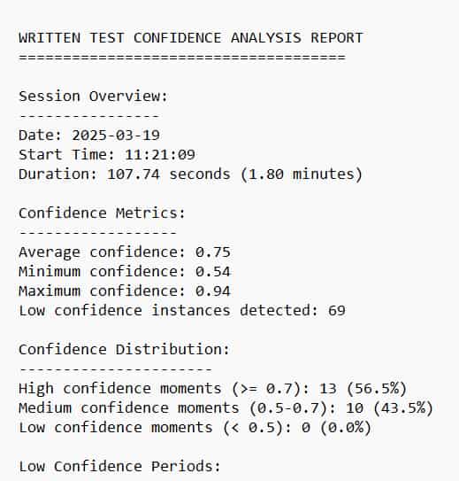 The confidence detection was designed using computer vision along with several other libraries. The main usage for the detection was “Deepface”, a facial analysis library built on top of deep learning frameworks that provides several capabilities. It provides high-accuracy facial analysis without requiring you to train your own deep learning models. The code analyzes facial expressions using DeepFace’s pre-trained neural networks to detect emotions like happiness, sadness, or fear. Confidence is inferred from the combined presence of ‘happy’ and ‘neutral’ expressions, suggesting a sense of certainty, while negative emotions may indicate doubt. Tkinter was used to create windows to display the live and final report from the camera detection, while the Pandas was used to analyze the confidence data captured from the camera.