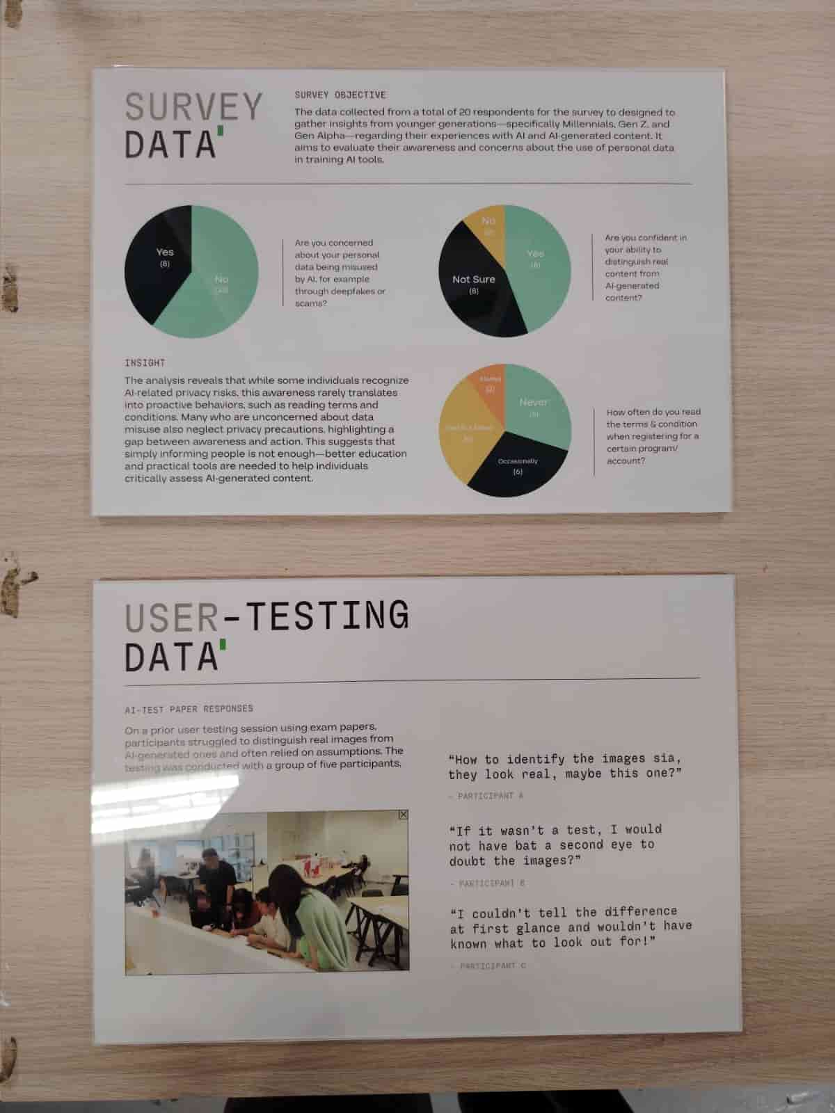 The last few prints that was required to be done was the prints of the artifact's description, design statement, test paper, answer sheet and the OAS sheet that people will be using to answer. The paper of the OAS sheet was also taken into account to ensure it has the same texture as the one we used for examinations to recreate the experience for visitors taking the test paper. I decided to include some data that was recorded from the survey as well as the user testing for test paper that done prior, to give a better context to the visitors on the purpose of this project.