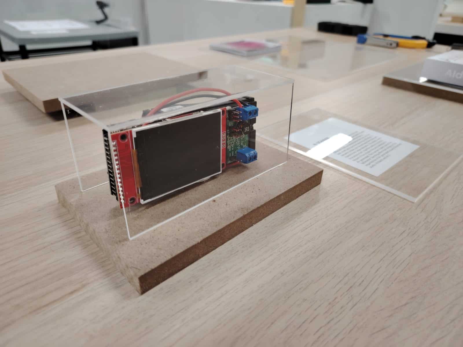 To make use of the failed ESP32-CAM experiment, I decided to fabricate a non-functional device encased in acrylic, designed to resemble a working prototype. This allowed the artifact to visually enhance the showcase without requiring user interaction. It serves as a speculative, bizarre-looking tech object that hints at potential near-future applications.
