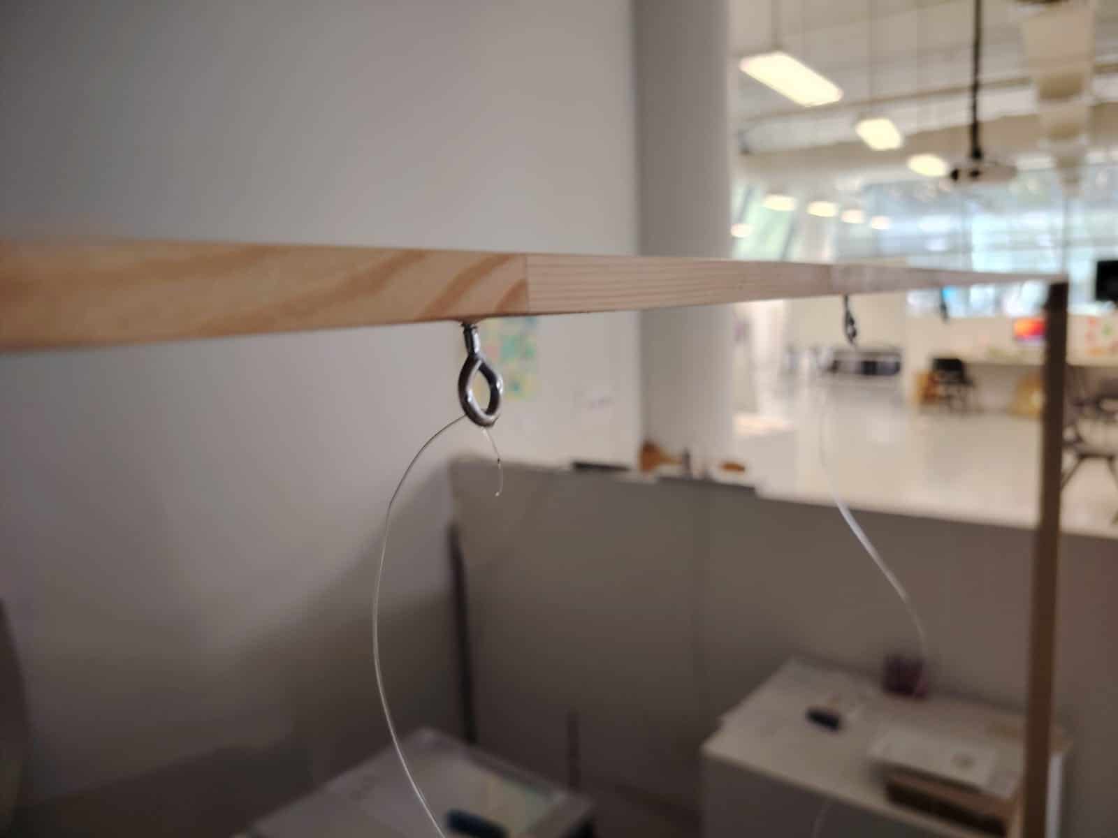 To make the hanging system functional, I first needed to build a frame to support the fishing lines. I purchased additional wooden frames from Artfriend and constructed the structure, securing it with L-shaped joints. To attach the fishing lines, I installed screw eye pins, which allowed the lines to be tied securely and adjusted easily. This setup also helps prevent overtension on the vents, ensuring stability and flexibility.