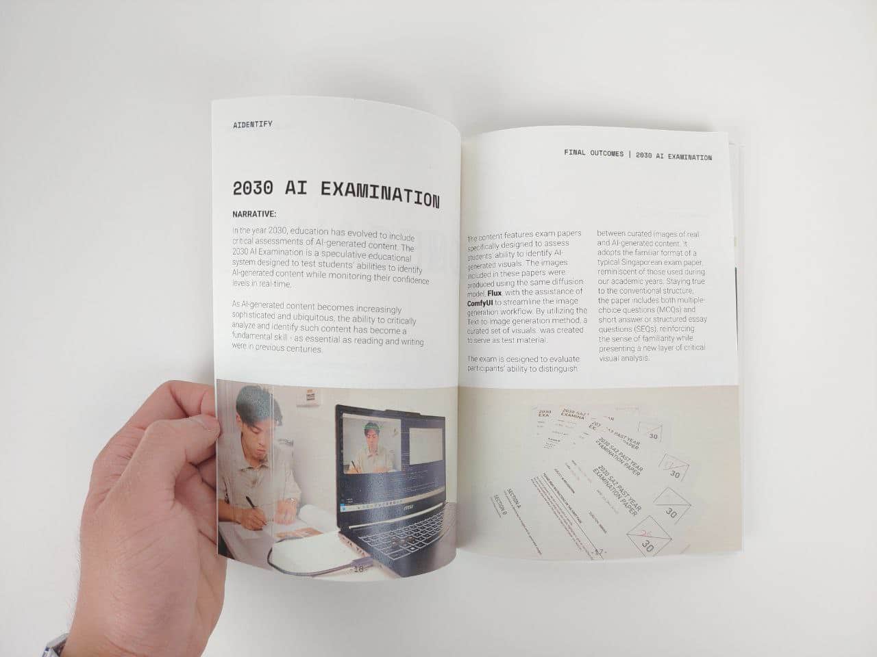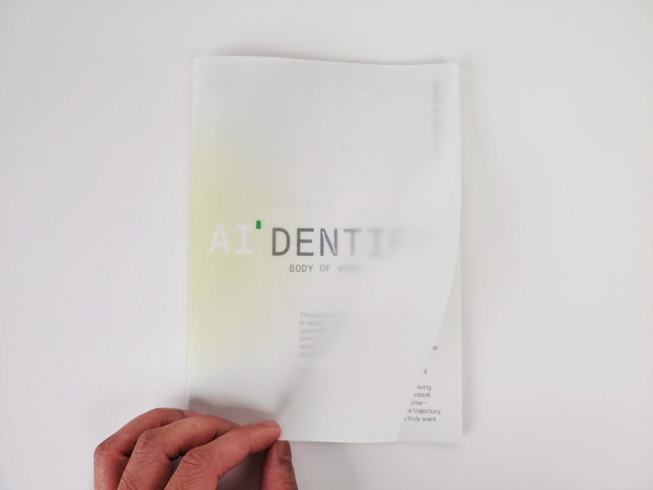 For the choice of paper, I selected Reclaim paper (100gsm) for the main body and used tracing paper as the cover material. This decision was made both for practical reasons—such as the lightweight, eco-friendly quality of Reclaim paper—and for conceptual alignment with the project's theme. The translucent tracing paper cover was a deliberate design choice to represent the "blurred lines" between reality and AI-generated content, visually reinforcing the central question of authenticity that runs throughout the work. By embedding the theme directly into the materiality of the publication, the piece invites readers to engage with the ideas of transparency, distortion, and uncertainty right from their first interaction. Critically, this choice moves beyond aesthetics; it situates the publication itself as part of the speculative narrative, subtly challenging users to reflect on how surface impressions can often obscure deeper truths.