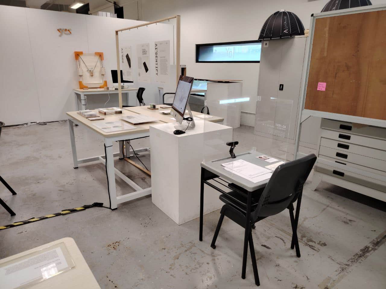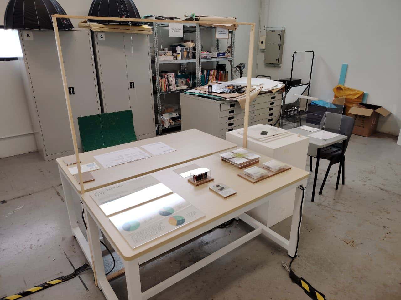 For the setup layout, I made several refinements, deciding to include additional materials that would better showcase the user testing evidence contributing to the development of the artifacts displayed on the table. Recognizing the importance of making the design process more transparent and traceable, I also printed and set up the publication documenting the body of work. This publication explains the technical choices behind each design decision, serving not just as supplementary information but as critical proof of the project's research depth. By doing so, the setup now not only presents the final outcomes but also invites viewers to engage critically with the iterative development process—reinforcing the speculative nature of the project and highlighting the informed choices that shaped it.