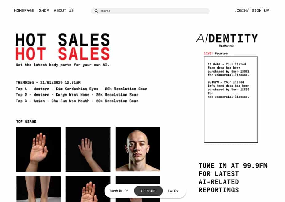As as designer how can I convey the message differently from the field of experts? I went back to one of the "what if" narrative that I had on the objectifying human parts with generated images. Therefore, I created a quick mockup for a website that sells your body parts(images). The website will consist of trending body parts that could be used for their AI-models. In addition, there are "news" on AI-developments that people can tune in to.However, I felt that it was a rather straightforward approach which still lacked the impact to raise awareness.